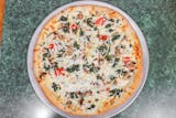 With spinach mushrooms, onions, tomatoes, ricotta, and extra mozzarella.